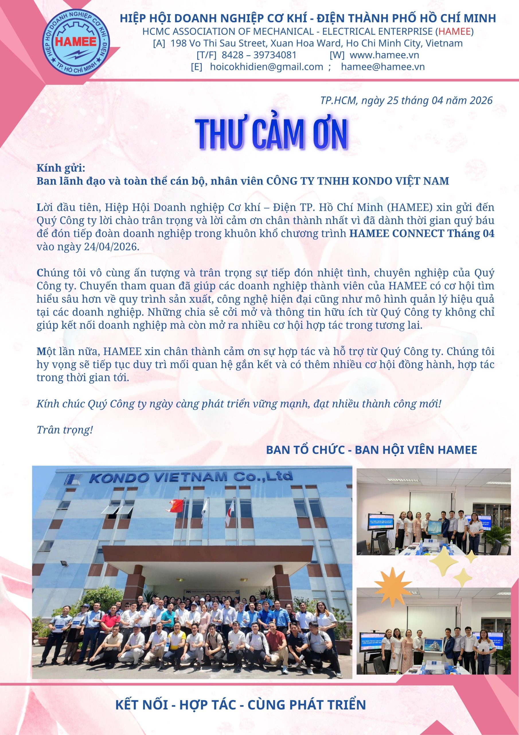 Ban Tổ chức HAMEE Connect chân thành cảm ơn sự đón tiếp tận tâm từ Quý Công ty TNHH Kondo Việt Nam và Quý Công ty TNHH Juki Việt Nam, giúp chuyến tham quan không chỉ hiệu quả mà còn nhiều giá trị kết nối.