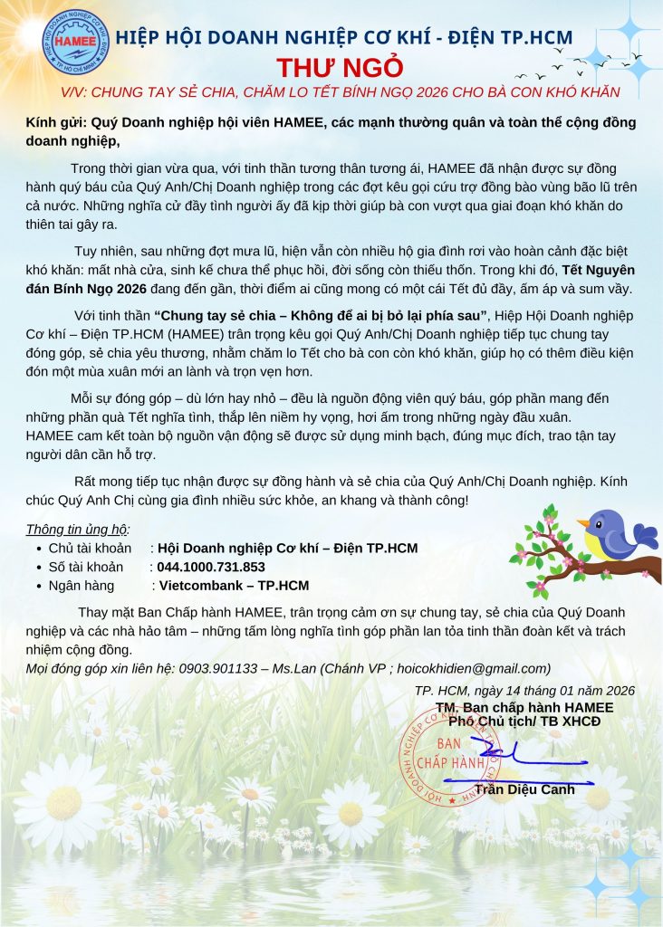 Với tinh thần “Chung tay sẻ chia – Lan tỏa yêu thương”, Hiệp Hội Doanh nghiệp Cơ khí – Điện TP.HCM (HAMEE) trân trọng kêu gọi Quý Doanh nghiệp, Quý Anh/Chị hội viên tiếp tục đồng hành, chung tay đóng góp, sẻ chia để mang đến cho bà con khó khăn những phần quà Tết ấm áp, nghĩa tình, góp phần tiếp thêm niềm tin và hy vọng trong mùa xuân mới.