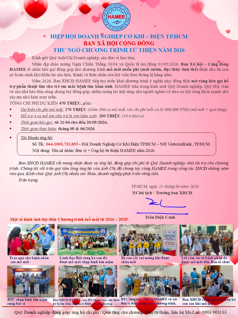HAMEE trân trọng kêu gọi Quý Doanh nghiệp, Quý Hội viên và các mạnh thường quân cùng chung tay đóng góp, góp phần mang lại ánh sáng cho người nghèo và trao cơ hội sống khỏe mạnh cho các em nhỏ kém may mắn. Mọi sự đóng góp không chỉ là sự hỗ trợ về vật chất mà còn là nguồn động viên to lớn, tiếp thêm niềm tin và hy vọng cho những hoàn cảnh khó khăn vươn lên trong cuộc sống.